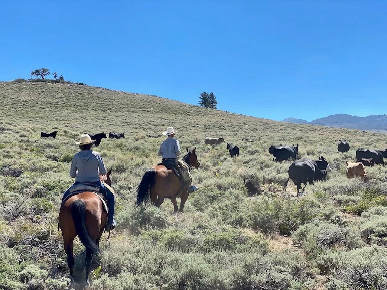 At this point in time, my husband Brett Reed is the Ranch Manager for the Washoe Tribe of Nevada and California. They run a herd of commercial cattle, which we take care of, based in Carson Valley. Our horses need to gather in different terrain, sort cattle in the corral, participate in branding, and be versatile. We also help several ranches that run cattle on permits in the Sierras in the summer. That requires horses that can travel in rough country, are comfortable being alone, and have no issues with water crossings and downfall.
