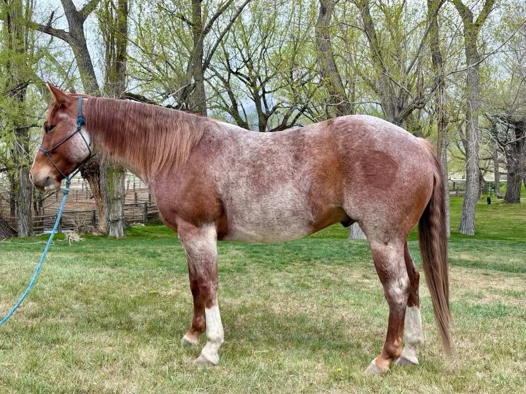 “Skittles” has done a lot of ranch work over the past couple of years. Trailing cattle, loading trucks, branding calves, sorting in the alley and out of rodear. He can handle a big circle with ease and still have the mental capacity to be good inside. He is kind and willing with a good work ethic. Can be laid off for long periods of time with no problems. He gets a little lonesome when left tied alone, but is good to ride out alone or with a crew. Good to catch, lead, load and shoe. No Blemishes.